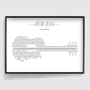 Onze collectie gepersonaliseerde Songtekst Posters stelt je in staat om je favoriete songteksten op een stijlvolle en unieke manier te vereeuwigen. Of het nu een tijdloze klassieker of een moderne hit is, deze posters zijn het perfecte aandenken of cadeau voor muziekliefhebbers. Voeg een persoonlijk tintje toe aan je huisdecoratie of geef een attent, gepersonaliseerd cadeau met onze hoogwaardige, gepersonaliseerde tekst- en citaatposters.