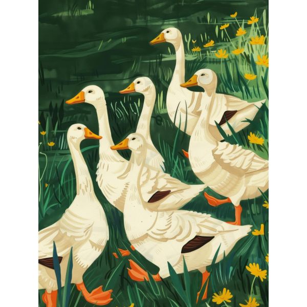 Deze levendige poster toont een groep eenden in een weelderige voorjaarsweide, omgeven door bloeiende bloemen. De rijke kleuren brengen warmte en een gevoel van natuur in elke ruimte. Een perfecte aanvulling voor dieren- en natuurliefhebbers. Het product bevat slechts één poster.